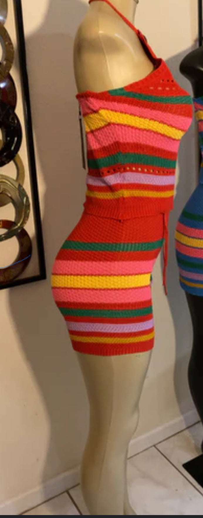 Add a pop of color to your wardrobe with this Striped Knit Crop Top & Shorts Set. The vibrant rainbow stripes and textured knit fabric create a bold, trendy look that’s perfect for warm days or casual outings.